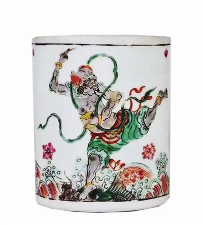 清康熙五彩“魁星点斗”笔筒(图①),筒形,腹径稍收,人物顶天立地。“魁星点斗”图案在晚明的瓷器上就已经开始出现,但更为大量制作是在清康熙年间。