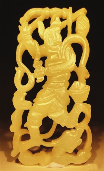 明“魁星点斗”镂雕玉件(图③),魁星一手握笔,一手握银锭,寓意“必定如意”。
