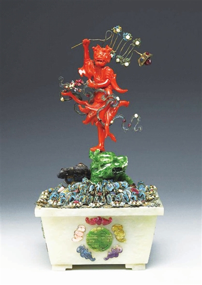 台北故宫博物院藏清代“魁星点斗”盆景(图④),红珊瑚雕成的魁星,单腿站立在碧玉雕成的鳌头上,玉盆上用彩色宝石镶嵌五福捧寿图案,设计巧妙,生动传神。