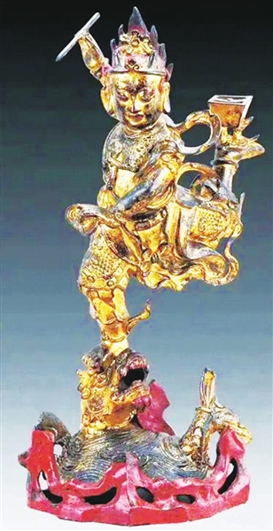 清朱金木雕“魁星点斗”纹木雕(图⑥),魁星金粉涂身,右手执笔,左脚翘起托一“斗”,右脚踩在海水中翻腾的巨鳌头上,取意吉祥。