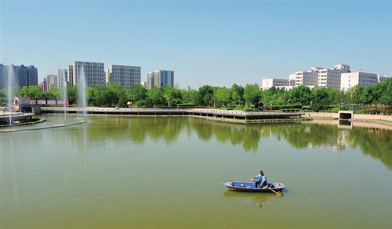 6月13日,晋阳街公园工作人员正在清理湖面杂物,做好各项准备工作,应对汛期到来。李学军 宋卫东 摄