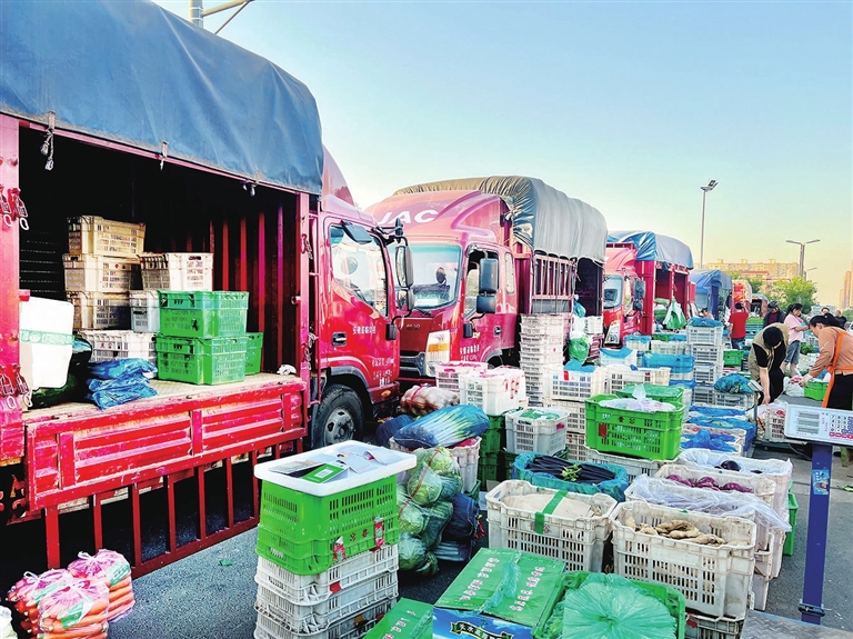 一路向东,至军民路口,画风突变,吆喝声起。拐角处向南延伸,高大的厢式货车绵延几百米,每台车下都是忙绿的身影,搬菜的、记台账的、回答询问的……一箱又一箱各式蔬菜前,电动车来回穿梭,骑车人选好菜品,整捆放置在踏板上,“嗖”的一声开远了。他们大多经营着“小摊摊”,或餐馆,或菜店。那些拎着购物袋低头挑来拣去的,多是附近居民,赶早来,为了一家人的餐食,新鲜而便宜。