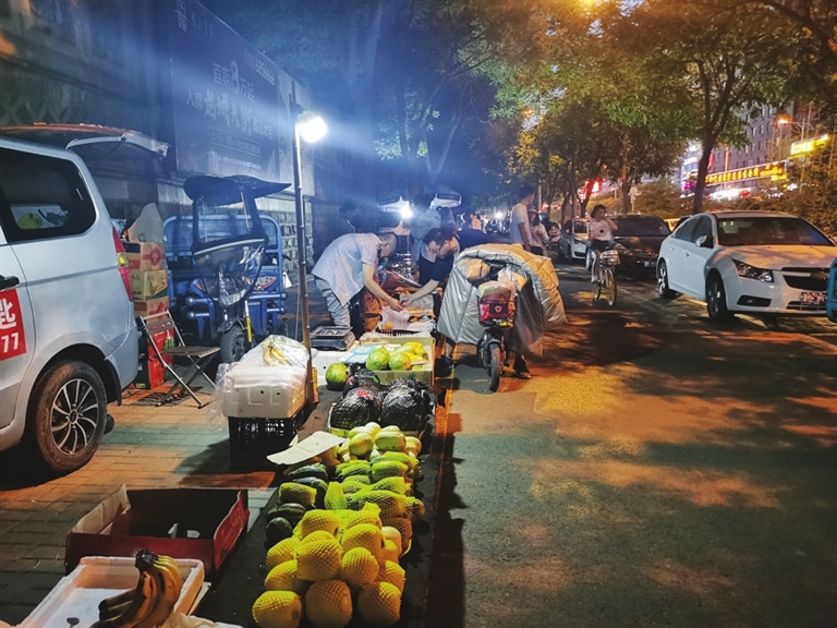 6月18日晚8时,记者实地查看,体育南路从晋阳街至龙城北街路段,放眼望去,流动摊贩、三轮车、货车随意停在放人行道上,将原本较为宽敞的人行道挤得满满当当。在一个水果摊前,摊主正将筐内已腐烂的水果丢到身后的马路上。一些包装箱、塑料袋和包装纸,被随意摆放或丢弃在道路两侧。当晚9时,记者离开时,马路市场依旧灯火通明,商贩的叫卖声、讨价还价声、电动车喇叭声此起彼伏。