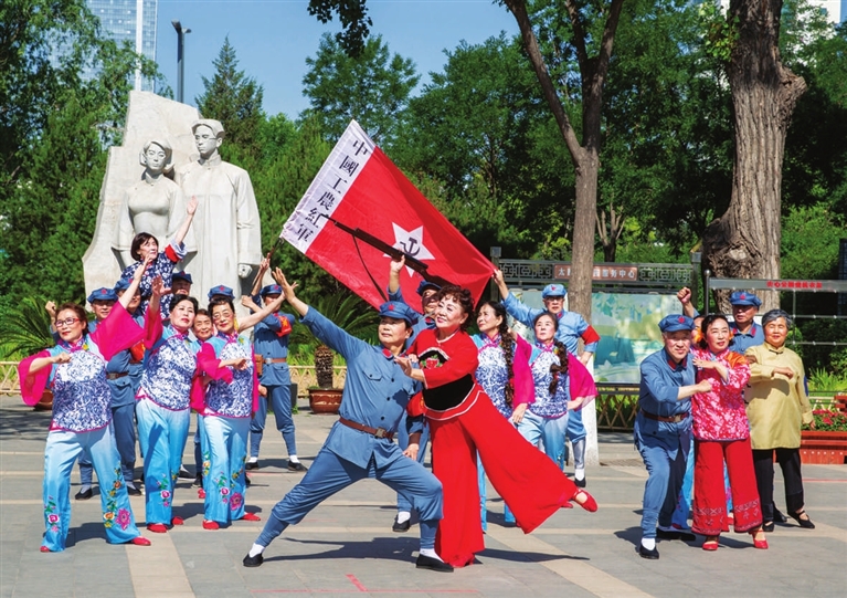 在党的生日即将到来之际,6月23日,太原九中老三届舞蹈队在青春缤秀园内进行演出。徐浩轩 摄