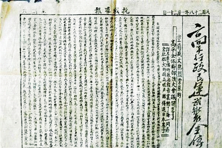 《抗战导报》1939年9月停刊,仅仅发行了一年时间,留存到现在的非常少见。从报纸中可窥见当时的社会现状、民情风貌,不仅高度还原了高平抗日战争初期的历史面貌,也为后人研究抗日战争提供了真实史料。 高平市孟建清收藏的这张《抗战导报》,刊载了薄怀奇号召动员高平广大抗日民众积极投身抗战的文章。这篇文章,是抗战政治宣言书,是抗战分析报告,是抗战决心书。