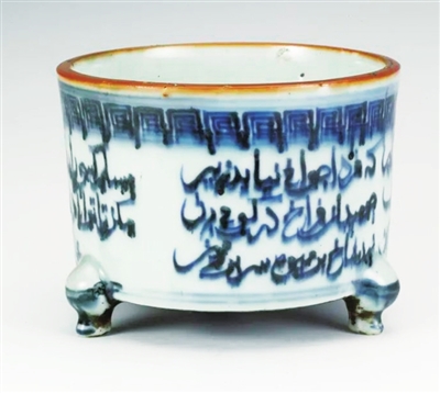 此件文物高11.7厘米,口径15.3厘米。炉呈筒形,唇口,平底,下承以三马蹄形足,器底边缘施有宽2厘米的一圈釉,中间无釉,有修胎痕迹,器内光素无纹饰,唯口内沿下署“大同马氏书”款,表明此类器物外壁文字可能为马氏亲手所书。外有青花装饰,口沿处绘青花单线连续回纹一周,炉底边有两条青花弦线横越三足;腹部以青花料书写有三行波斯文,取自波斯诗人萨迪的诗集《果园》;内底有“天顺七年大同马”款。这件筒式三足炉造型比例适度,胎体厚薄适中,修胎规整,釉面白中闪青,发色浓重晕散且有铁质凝聚斑;波斯文字书写流畅,中锋用笔,圆润洒脱,一气呵成,既起到装饰的效果,又以优美的文字内容表达了制作者的思想境界。