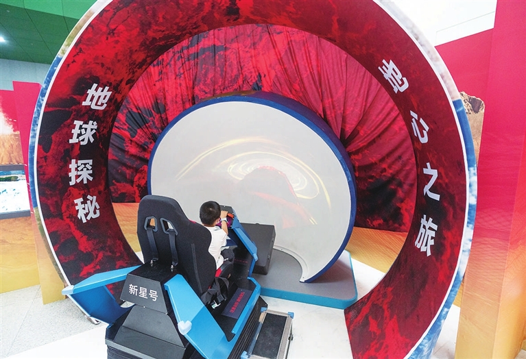 七月四日,一名儿童在中国科技馆举行的地热科普公益展上体验展览项目“地心之旅”。