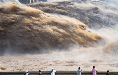 7月4日,游客观看黄河小浪底水库排沙出库。当日,黄河小浪底水库开始排沙,裹挟着泥沙的混浊水流从小浪底出水口排沙洞喷涌而出,场面壮观。 新华社发