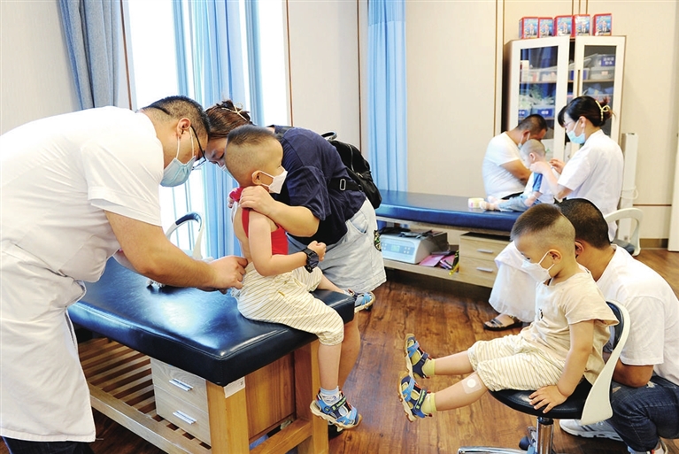 7月6日,市妇幼保健院长风院区内,一对双胞胎正在贴敷三伏贴。根据中医“冬病夏治”的理论,三伏贴可以有效增强抵抗力,预防冬季易发的疾病。 牛利敏 摄
