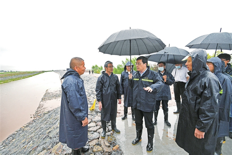 进入主汛期以来,我市已经历多次强降雨过程,防汛形势严峻。市委、市政府高度重视防汛救灾工作,加强会商研判、指挥调度,及时启动应急响应。各级各有关部门闻“汛”而动,严防死守、全力应对。在市城市综合管理服务指挥中心,韦韬听取全市防汛救灾、河道防洪、排水防涝和数字化城市管理运行等工作汇报,通过视频监控察看市内易积水点位实时情况,要求强化巡查检查,加强值班值守,高效应急处置,全力确保防汛安全。晋阳街雨水泵站承担着我市南部55平方公里城区的排水防涝任务,抽排水能力可达每小时13万吨。韦韬走进格栅间、水泵间,察看格栅排污机、水泵机组等设备运转情况,了解区域排涝状况,强调要强化运营维护,提升抢排能力,努力将强降雨对城市造成的影响降到最低。乌马河是汾河的区域性支流,目前清徐县去年“秋汛”水毁段修复加固工程、河道治理主体工程已完工,行洪能力得到有效提升。在乌马河小武村段,韦韬听取清徐县灾后重建、河道治理等情况介绍,冒雨沿堤岸察看水情水势、治理成效,强调要认真总结经验,提高防洪标准,做好汛情预警,加强河道巡查,确保行洪安全。在乌马河支流象峪河孟封段,韦韬询问上游水库下泄流量,与相关部门研判防汛形势,要求密切关注雨情变化、汛情发展,做好巡坝查险、除险加固等工作,有效防范应对重大洪涝灾害。
