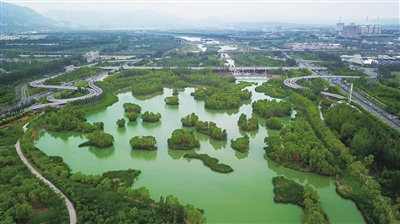 7月16日,鸟瞰汾河景区柴村桥段,处处绿意盎然,勾勒出一幅城在林中、景在画中的生态画卷。 李学军 宋卫东 摄
