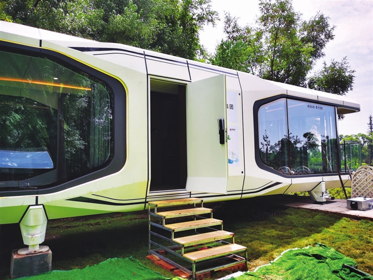 当天,主办方华阳集团现场展示了气凝胶在工业、粮食仓储、康养旅游、疫情防控等多种环境下的全新应用。户外展示现场,一座外形时尚抢眼类、似“太空舱”的智能休闲可移动生态民宿伫立在湖边。这是华阳集团与省机关事务管理局深度合作,发挥双方优势,共同开发的新一代智能休闲可移动生态民宿。舱内分隔为两个房间,一侧落地窗可以欣赏到湖边景致,另一侧是森林绿地,这种新材料使舱内温度凉爽,配合草坪上的气凝胶天幕、帐篷,堪称完美。吸引大家目光的还有“零能耗小屋”。屋顶安装光伏设备,内铺气凝胶毡、地热反射膜等,采用新风与自然通风一体化技术,在降低能耗、保温隔热基础上,提高了小屋的舒适度。“零能耗小屋”已安装到西藏边防第一线,为边疆战士筑起安全屏障。