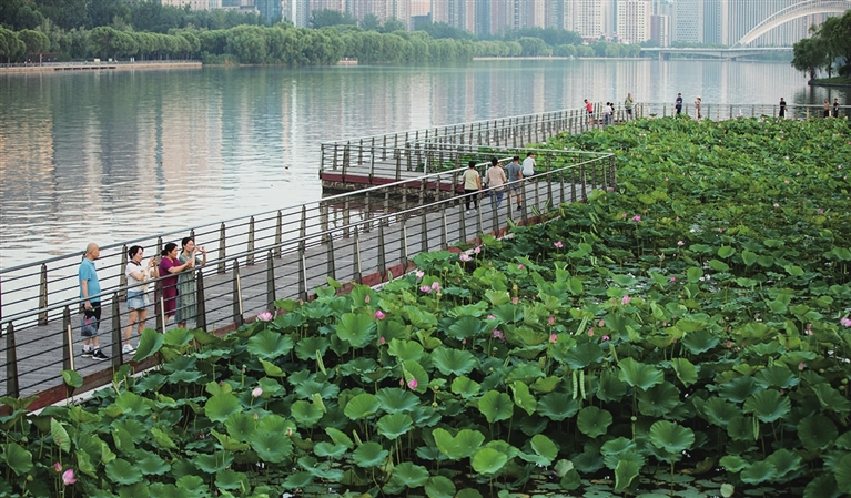 7月18日,长风商务区跻汾桥畔,盛开的夏荷吸引市民前来欣赏拍照。