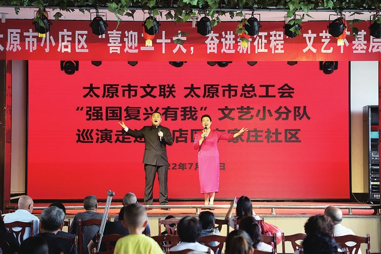 7月19日,由市文联、市总工会主办的“强国复兴有我”文艺小分队巡演走进小店区李家庄社区。文艺工作者以歌曲、小品、相声、朗诵等群众喜闻乐见的艺术形式为辖区居民带来欢乐。