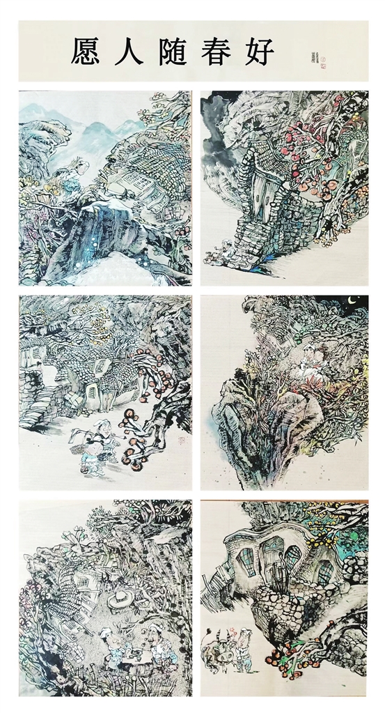 观察再细致点,还会发现王斌礼画作的另一个奇特之处,即在不合常理中抓住它的合理性。《愿人随春好》组图就是这样别出心裁的作品。弯曲变形的密集线条,引出不合常理的村居画面,简笔勾出的人物矗立其间,竟十分协调、自然、合理。他以视觉对撞的景物安排,营造了一个个怡然祥和的感情环境。作品构思出奇制胜,实在精妙。从这里,我们不仅能看到他精湛的表现技巧,也能看到他独特的造型能力。