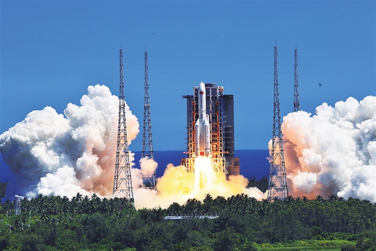 7月24日,搭载问天实验舱的长征五号B遥三运载火箭,在我国文昌航天发射场点火发射。 新华社记者 李 刚 摄