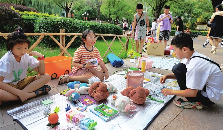 7月24日,小店区恒大绿洲社区以儿童跳蚤市场的形式吸引孩子们参与其中,通过旧物置换增强其节俭意识,丰富暑期生活。阴钰奇 摄