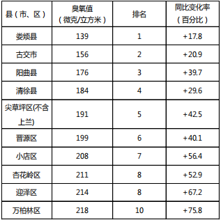 根据山西省太原生态环境监测中心数据,我市各县(市、区)2022年7月18日—7月24日臭氧污染由轻到重排名如下。