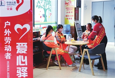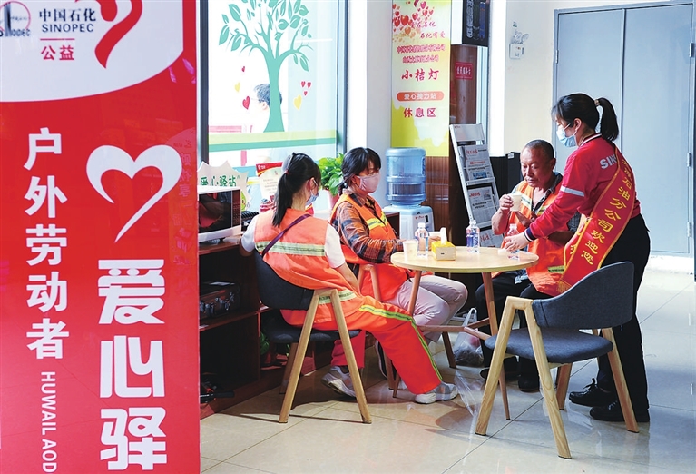 七月二十八日,滨河西路一加油站爱心驿站内,工作人员为环卫工人提供了免费饮水、充电、上网等爱心服务,感谢他们的辛勤付出。牛利敏 摄