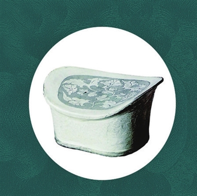 这件白釉剔花牡丹纹瓷枕呈腰圆形,枕面剔刻折枝牡丹,花卉枝叶疏朗,花瓣及叶片上篦划筋脉,线条流畅,纹饰隽美,素雅大方,为孟家井窑瓷器中的精品。
