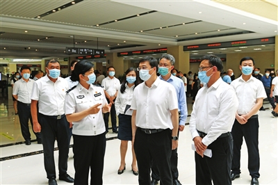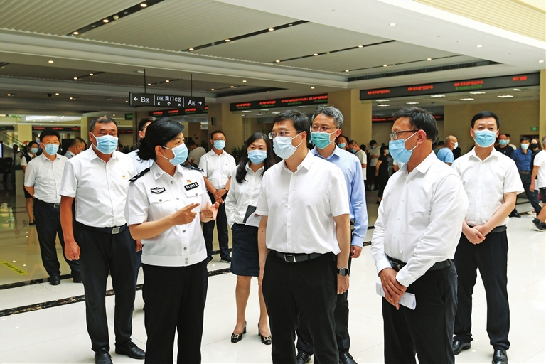 市政务服务中心是服务企业群众的重要窗口。韦韬步入中心,听取“一枚印章管审批”改革情况汇报,走到企业登记注册、公安业务、不动产办理、工程建设项目联合审批、社会事务、社会保险等服务区域,询问办理事项、审批流程、便民措施,了解线下“一窗办结”、线上“一网通办”等审批服务改革举措,要求进一步深化“放管服”改革,学习借鉴先进地区经验做法,不断优化审批流程,提升服务效能,最大程度为市场主体创造便利。