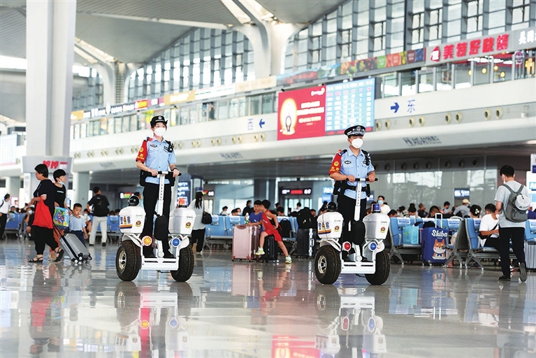 暑运期间,太原南车站派出所将“百日行动”与当前安保任务深度融合,确保旅客出行安全。8月4日,太原南站,民警在候车大厅巡逻。牛利敏 宋卫东 摄