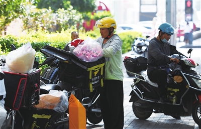 八月四日,省城亲贤街一家鲜花店外,“跑腿”小哥扎堆前来取花。七夕节当天,即时配送服务为消费者打造“甜蜜不断”的浪漫体验。邓寅明 摄