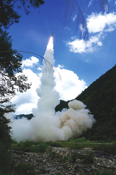 左图:8月4日,东部战区火箭军对台岛东部外海预定海域实施火力突击。这是导弹升空。