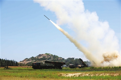 下图:8月4日,东部战区陆军某旅组织远火分队在台湾海峡组织实弹射击,完成精确打击任务。这是发射现场。