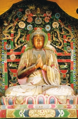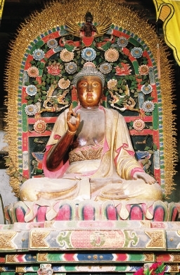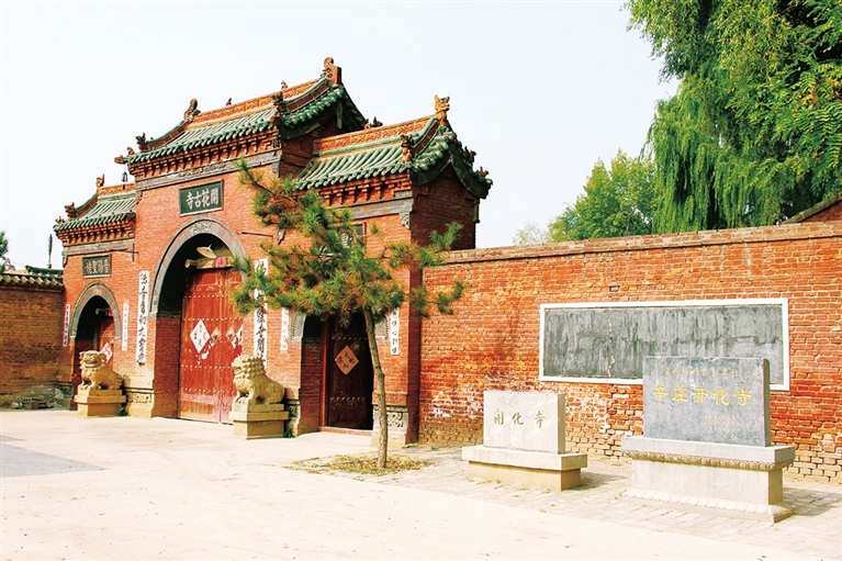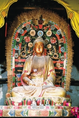 天王殿前有一六角经幢,经考证为金大安年间(1209-1211)刻制的《佛顶尊胜陀罗尼经》。经幢高1.55米,立于莲花台上,上有盖,盖上有宝珠。各面均刻有经文,一面刻有浮雕佛像,保存完整,但经文因久经风雨,风化严重,难以辨认。 大雄宝殿,原貌原物,保存完好,是整个寺庙最珍贵的文化遗产。坐北向南,砖砌台基,高0.7米。面阔三间,进深六椽,悬山筒瓦覆顶,琉璃瓦剪边。出前廊,檐下施五踩双昂斗栱,柱头饰龙嘴含珠泥塑,檐柱施覆莲柱础。门额悬清光绪三十四年(1908)牌匾,上书“德合无疆”。 殿内佛台上塑释迦牟尼佛三身佛像,左右分别为四智菩萨和阿难、迦叶,护法金刚分列两侧,共计11尊,均保存完好。塑像技艺精湛,色彩明丽,为太原地区明代泥塑之精品。据碑文记载,大雄宝殿东西山墙上原绘有水陆壁画,现壁画无存。