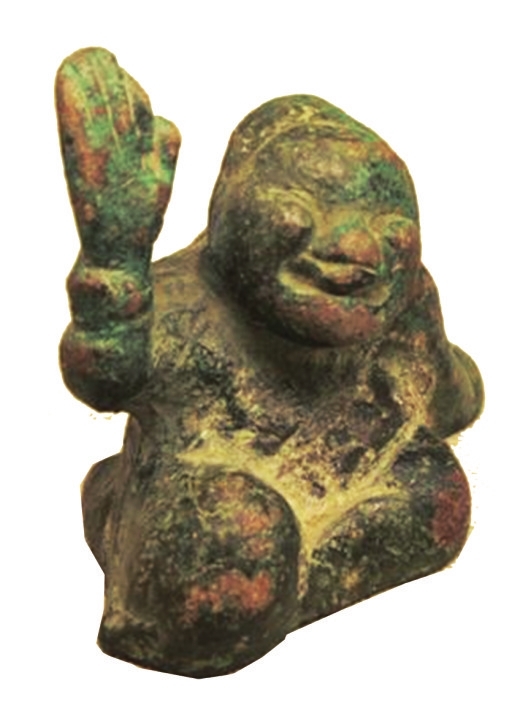 这组俳优俑铜镇出土于山西朔州市平朔汉墓中,出土时分置于四角,下面有案榻残留漆皮和朽木痕。西汉时,家庭常用的坐具有席、榻和床等。席软而易卷,镇是汉代家庭用具中常见之物,用作席子四角的压镇物。
