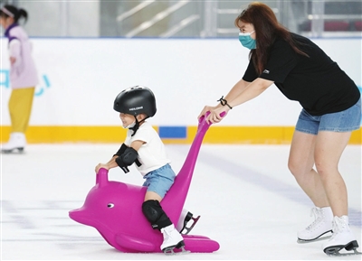 8月6日,一位小朋友和家长在“冰立方”冰上运动中心体验滑冰运动。近日,北京“冰立方”冰上运动中心开始试营业,并计划于8月8日“全民健身日”正式营业。