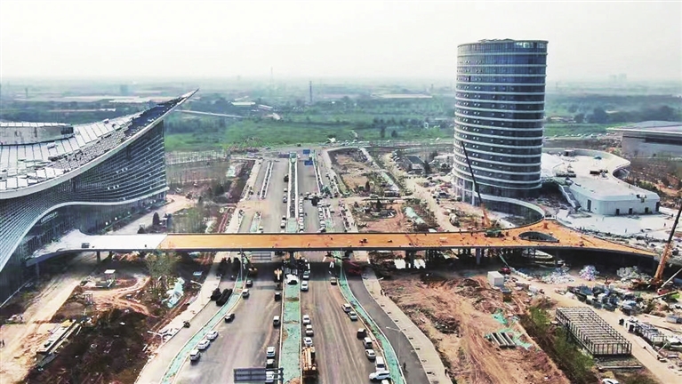 在施工一线,该公司项目部精心组织,合理安排,面对连桥横跨姚村规划路道路施工无法作业、疫情影响以及与会议、酒店总包方交叉作业等情况,团队成员一起动脑筋、出思路、想办法,全力以赴克服困难、抢抓进度,在实际作业期20天内完成了连桥吊装。