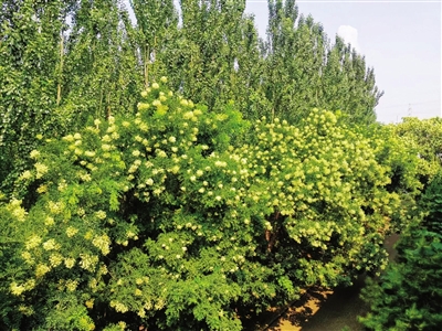 我走过220米长的敬业路,看到在路北端出口有两棵怀抱粗的大槐树,像两名忠诚的卫士,守护着干部职工的安全。槐树约10余米高,绿荫如盖,交织的枝干虬曲苍劲,布满了岁月的皱纹。那遮天蔽日般的苍绿茂盛的枝叶间,如今正点缀着一串串槐花,散发着缕缕槐香。