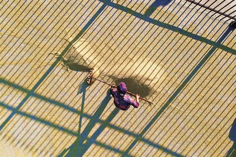 8月13日,在湖南省双峰县荷叶镇新田村,农民晾晒稻谷(无人机照片)。 新华社发