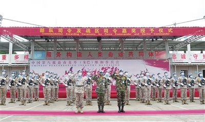 联合国驻南苏丹特派团(联南苏团)部队司令乔杜里少将与朱巴战区司令拉赫曼准将11日向中国赴南苏丹(朱巴)维和步兵营105名官兵颁发“司令嘉奖”,以表彰他们在执行联合国维和任务中作出的杰出贡献。