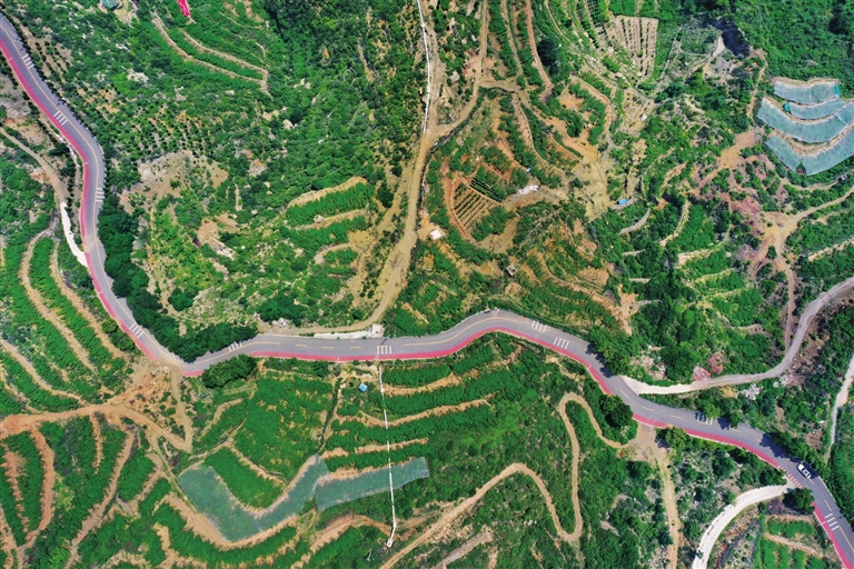 8月14日,俯瞰升级改造后的清徐县西边山旅游公路,宽展的车道、太阳能路灯极大地方便了游客出行,带动了周边旅游业的发展。韩双喜 宋卫东 摄
