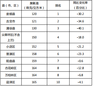 根据山西省太原生态环境监测中心数据,我市各县(市、区)2022年8月8日—8月14日臭氧污染由轻到重排名如下。