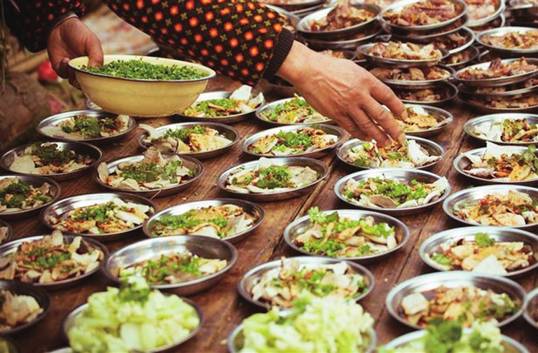 这具有代表性的八碟八碗更是在不同场合有着不同的变化:“寿席食九,婚宴食八,丧饭食七。”寿宴“食九”是在八碗增加一道菜,谓之为寿星增福增寿。喜宴“食八”,源于人们都偏爱“双数”,特别是八这个数字,暗合中国传统的八观八验识人法则,又彰显喜庆吉利。大多婚宴都会选择八碟八碗,十六道坐底菜,对于新人来说寓意为“早日发家”,对于来的宾客而言,则寓意为“婚宴吃八,家家都发”。丧饭“食七”是指先人逝去,后人举办丧葬酒席,凉菜只能上七道菜。少一道菜,寓意少了一人,主家有缅怀之情。