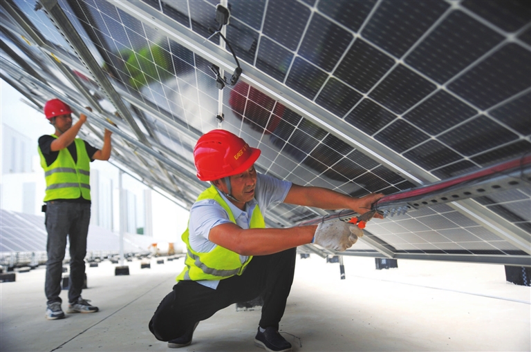 8月18日,太忻一体化经济区(太原区)杏花岭片区重点项目——华能太原杏花岭区屋顶分布式光伏发电项目施工现场,施工人员正在对光伏面板进行保养,确保设备正常运行。徐浩轩 郝晨光 摄