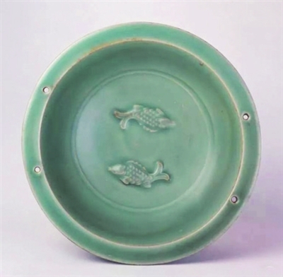 南宋末期,龙泉窑器物内底出现模制贴花双鱼纹装饰,双鱼鼓凸,形象逼真传神。此类双鱼纹青瓷的外壁常饰有宽莲瓣纹,少数内壁同时刻饰卷草纹,如北京故宫博物院藏南宋龙泉窑青釉素贴双鱼纹洗,印证了模印贴花双鱼纹已成为南宋时期龙泉窑的重要纹饰之一。