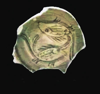 目前,有明确地层或纪年墓葬出土的南宋贴花双鱼纹龙泉窑瓷器较为少见,因南宋末期和元代初期风格相同,考古界常将这类瓷器统一至宋末元初时期。此时期龙泉窑青瓷上还出现“鱼龙”形象,有人又称之为“鱼化龙”或“摩羯”纹。“鱼龙”纹为龙首鱼身,凸目圆睁,张口露齿,须发后飘,鱼鳍呈花边状。亦为模制,多贴饰于器底。