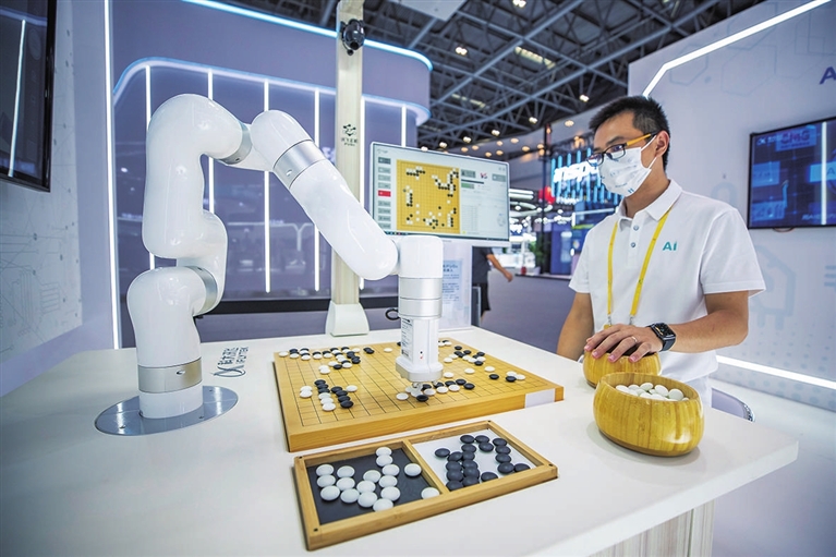 8月21日,2022智博会科大讯飞展厅的工作人员演示与弈棋机器人对弈。2022中国国际智能产业博览会将于8月22日至24日在重庆国际博览中心举行。本次智博会以“智能化:为经济赋能,为生活添彩”为主题,重点围绕国家发展战略、产业发展趋势,聚焦数字产业化、产业数字化,集中展示大数据智能化发展成果。