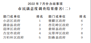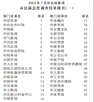 2022年7月1日到7月31日,市政府12345政务服务便民热线对各网络单位办结事项42448件进行了电话调查,电话调查成功的共32035件(占确定基数的75.47%),市民满意数17579件,经调查七月份平均满意率为54.87%。