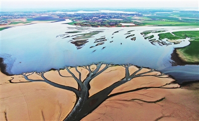 受连日高温少雨天气影响,中国最大淡水湖鄱阳湖水位持续下降。鄱阳湖进贤段水域滩涂在水流分支的冲刷下,呈现出栩栩如生的“大地之树”景观。