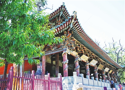 圣母殿的形制之奇特、规格之高,在全国现存的古建筑中是不多见的。为一尊“圣母”制殿,其高,无以伦比,其大,天下无双。门外大殿两尊5米多高、执兵器守卫的“哼”“哈”二将,无疑是海内外泥塑武士的翘楚。而殿前8根粗大的立柱上,盘着张牙舞爪、生动逼真的木雕龙,更彰显出曾经的皇家圣地之威严、不可侵犯。