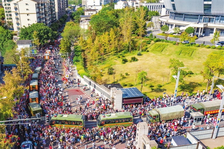 8月28日,在重庆市北碚区,群众自发来到道路两旁欢送森林消防队员(无人机照片)。 森林消防队员向前来送别的群众比心。