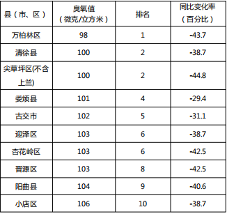 根据山西省太原生态环境监测中心数据,我市各县(市、区)2022年8月22日—8月28日臭氧污染由轻到重排名如下。
