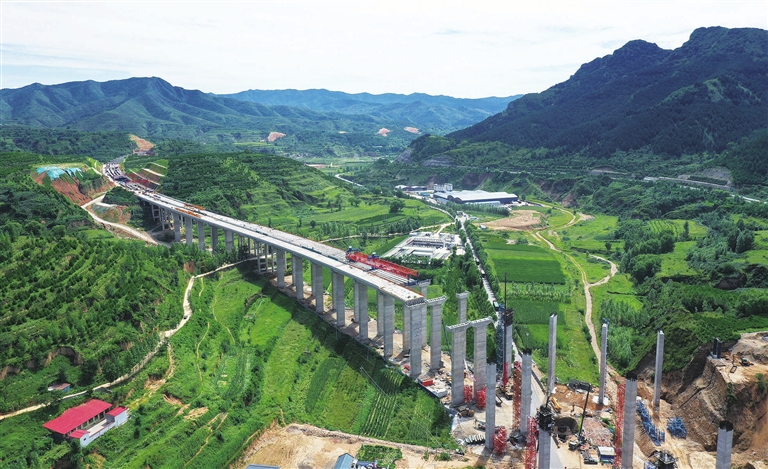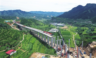 8月30日,作为太忻一体化经济区交通路网重要组成部分的阳曲县西凌井乡西北二环高速公路施工现场,立交桥桥面铺设有序推进。米国伟 摄