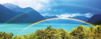 这是8月29日在巴松湖拍摄到的彩虹。巴松湖位于西藏自治区林芝市工布江达县。初秋的巴松湖湖水清澈,四周青山滴翠,景色宜人。新华社记者 姜 帆 摄